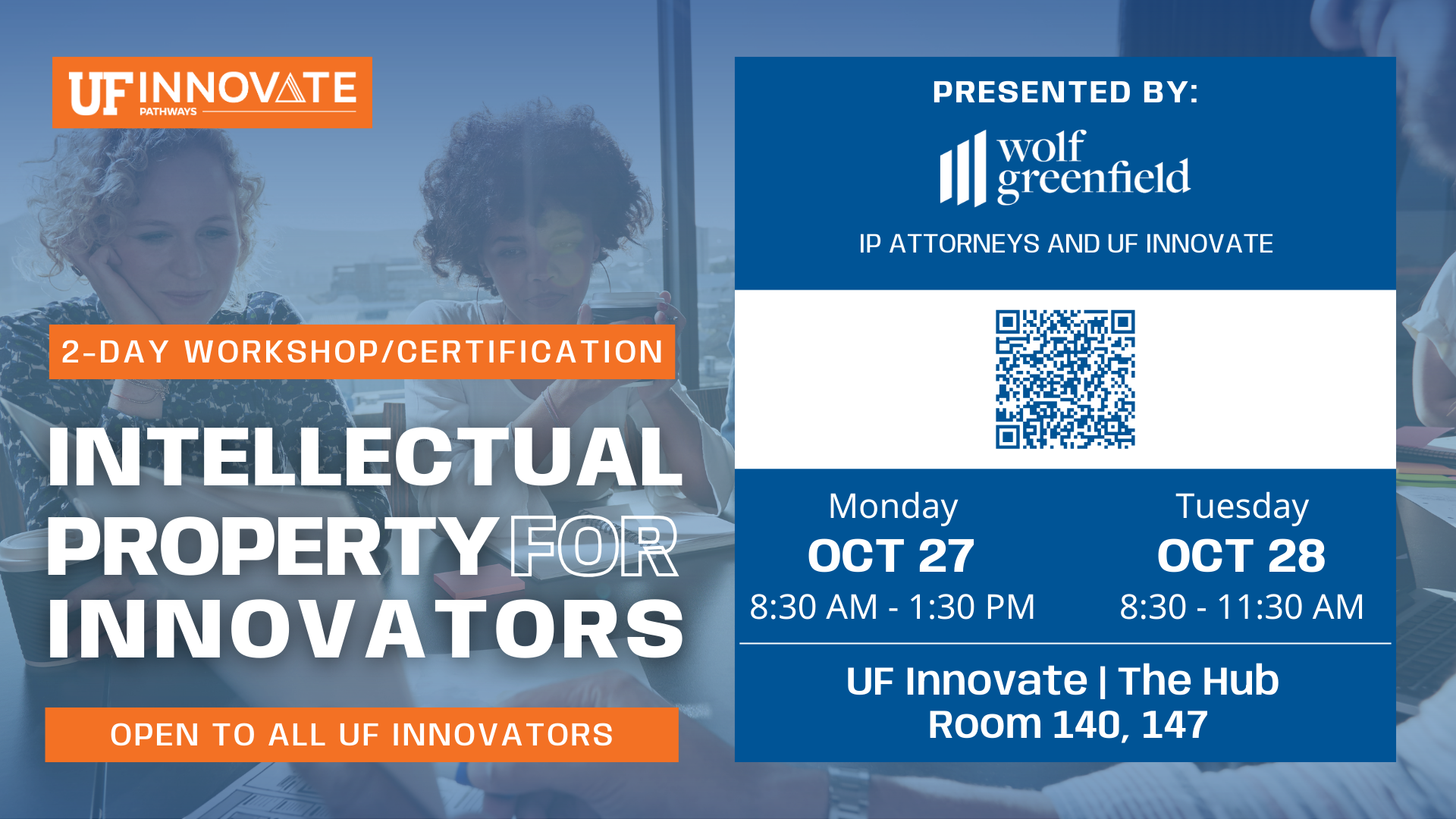 Do you know how to protect your ideas and create value through intellectual property (IP)? This hands-on training, open to all UF innovators, will provide the intellectual property basics to help you create impact through innovation. It includes breakout small group discussions and expert advice from the IP attorneys at Wolf Greenfield and the team at UF Innovate.