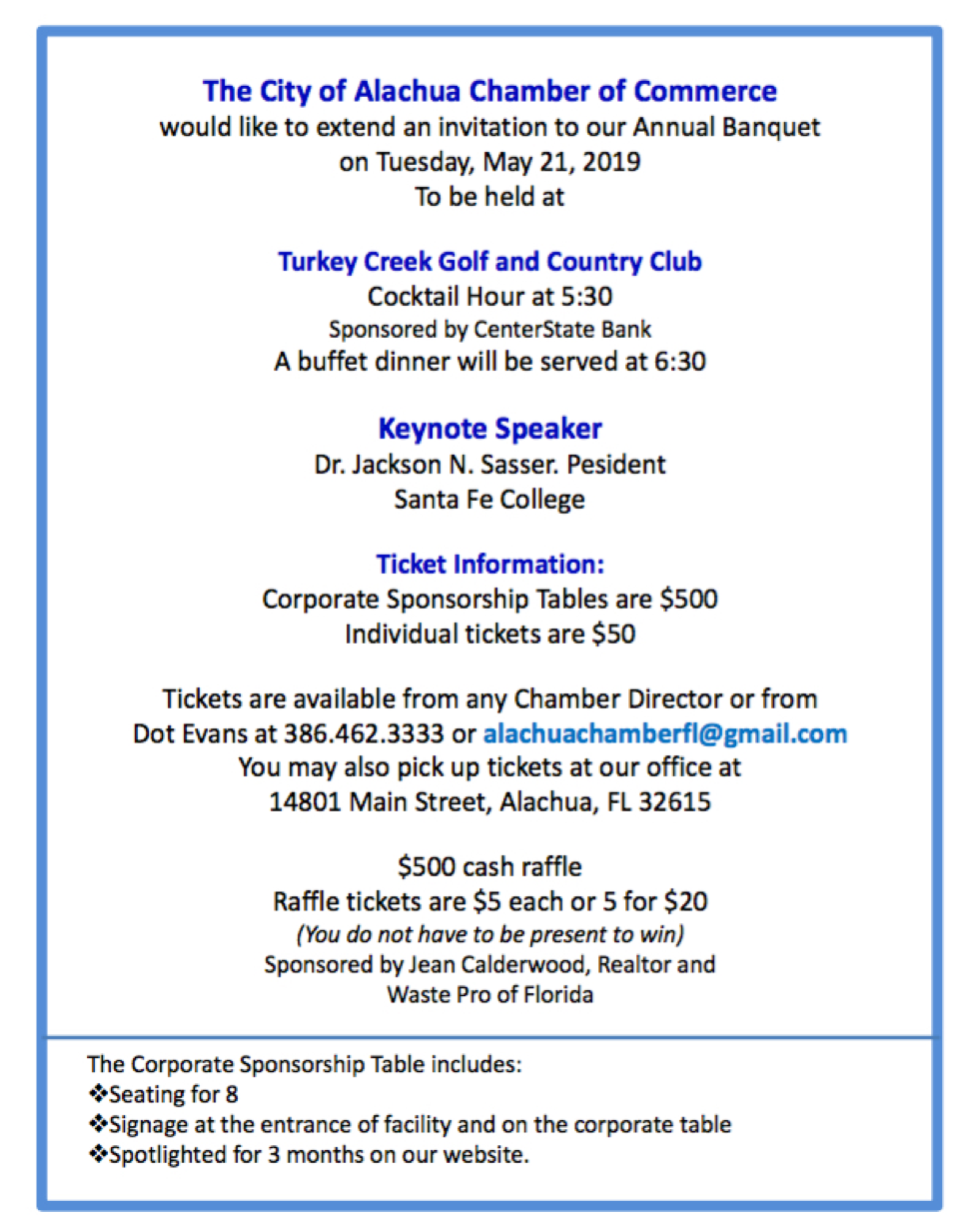 21may5:30 pm8:30 pmAlachua Chamber of Commerce Annual BanquetKeynote speaker: Dr. Jackson N. Sasser, President of Santa Fe College