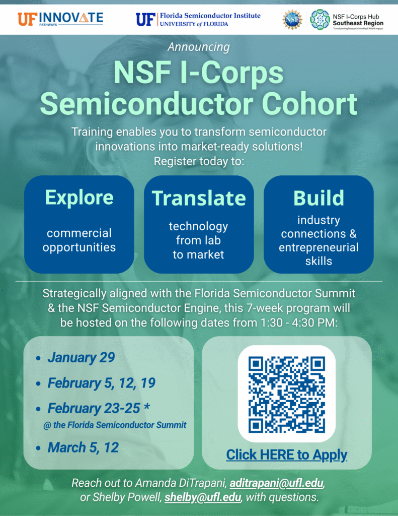 The NSF I-Corps Southeast Hub, in partnership with the Florida Semiconductor Institute and regional universities including UCF, USF, and FIU, is excited to announce a Semiconductor Cohort launching in Spring 2026, strategically aligned with the Florida Semiconductor Summit. This 7-week program invites researchers, entrepreneurs, industry professionals, and companies to transform semiconductor innovations into market-ready solutions through the proven I-Corps customer discovery process. Participants will benefit from tailored mentorship by experienced industry experts, gaining critical insights into market demands and customer needs to refine their technologies for real-world applications.